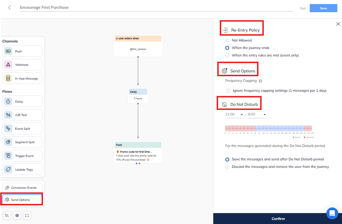 You can also click on the "Send Options" in the lower-left corner of the console to access features like "Re-Entry Policy," "Send Options," and "Do Not Disturb." These options help you send personalized messages at the most suitable times for each user, reducing user fatigue and maximizing marketing effectiveness: