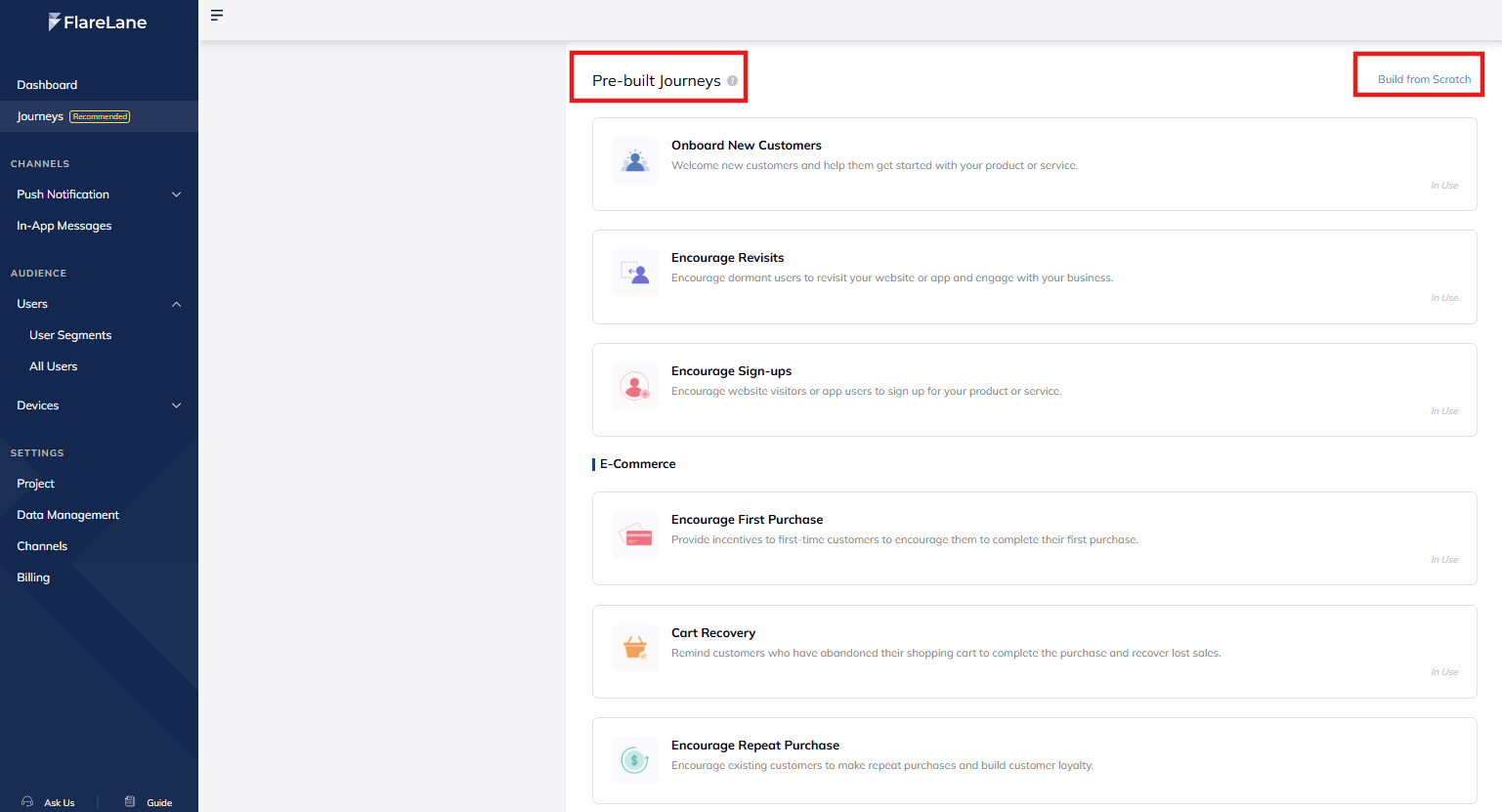The first step in automating the customer journey is choosing between "Pre-built Journeys" and "Build from Scratch." The recommended journey offers industry-specific automation templates crafted by FlareLane, allowing you to quickly set up key customer flows. Creating your own automation, on the other hand, enables you to design a more tailored journey for your customers.