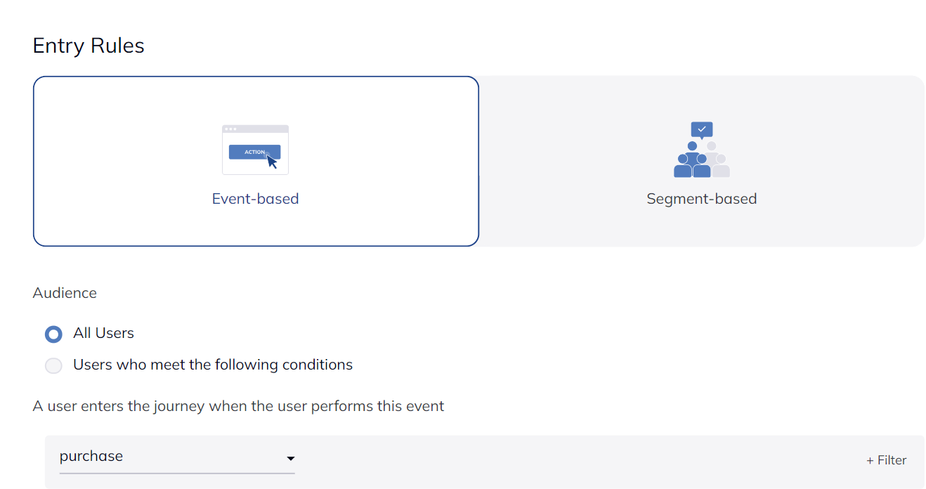 To explain the third option further, FlareLane requires clients to configure Entry Rules when creating customer journeys. If you choose the Event-based option, your users will enter a customer journey when they perform specified actions that trigger an event, such as adding an item to the cart. If you choose the Segment-based option, the journey begins when a user meets specified criteria (e.g., when the last login was seven days ago). Here's how FlareLane's Event-based configuration looks like on a console: