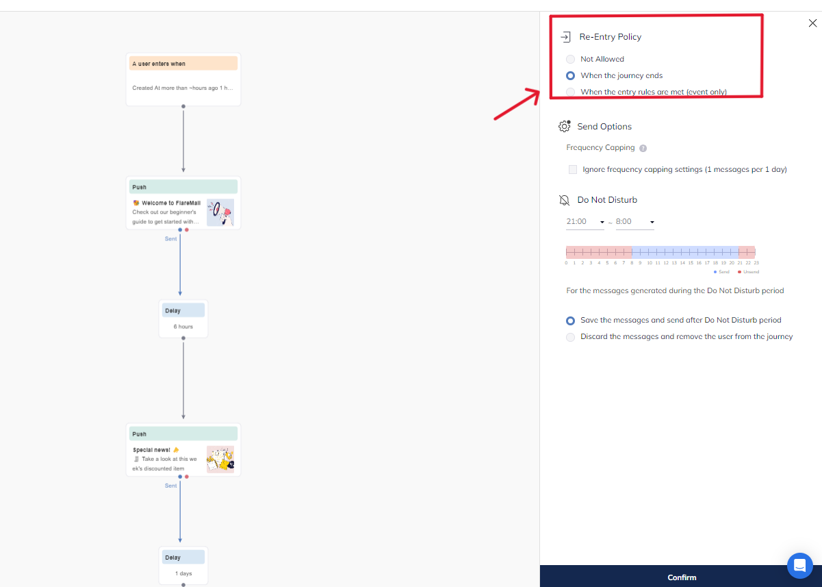 Combined with Frequency Capping and Do Not Disturb features, the Re-Entry Policy empowers brands to minimize user fatigue and maximize engagement, ultimately driving better campaign performance and stronger customer relationships.