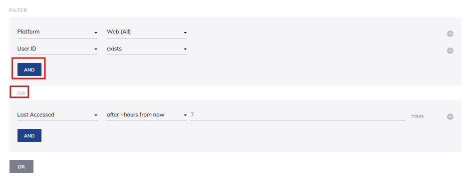 For instance, FlareLane’s segmentation feature allows you to refine your audience using "AND" conditions to narrow down segments through intersecting filters or expand your reach with "OR" conditions to broaden the application of filters: